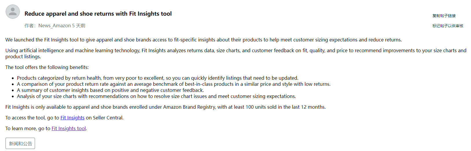 亞馬遜在公告中提到,F(xiàn)itInsights工具可分析退貨數(shù)據(jù)、尺碼表以及客戶對尺碼、質(zhì)量和價格的反饋,由此提議賣家對品牌尺碼表和產(chǎn)品列表進行優(yōu)化。