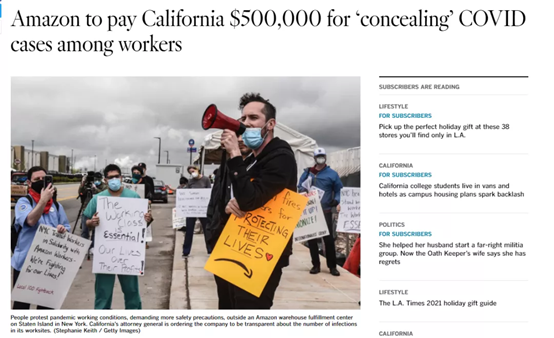 在此次判決當中,亞馬遜不但被開出了“疫情管控不利”罪名下最高的罰金50萬美金,更加是被規定一定要每一天將倉庫內的新冠感染狀況告知到其數萬名倉庫工人,并披露其工作場所的準確病例數。